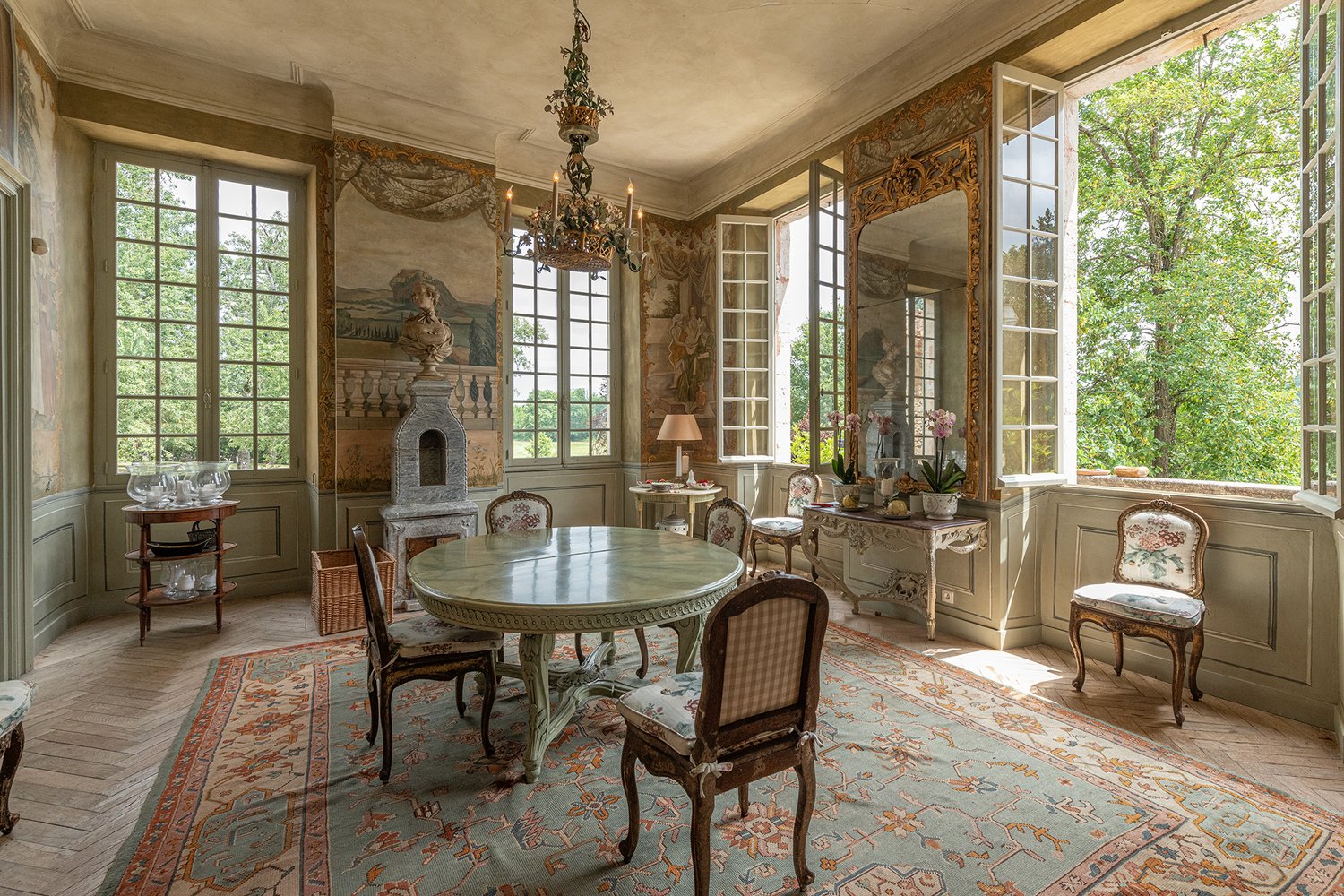 Over nearly three decades, owners passionate about antiques and nature have carefully restored the estate, meticulously preserving every detail, from wooden flooring to high ceilings. The 2001 renovation seamlessly integrated modern comforts with its historic character, transforming the property into a living showcase of craftsmanship.