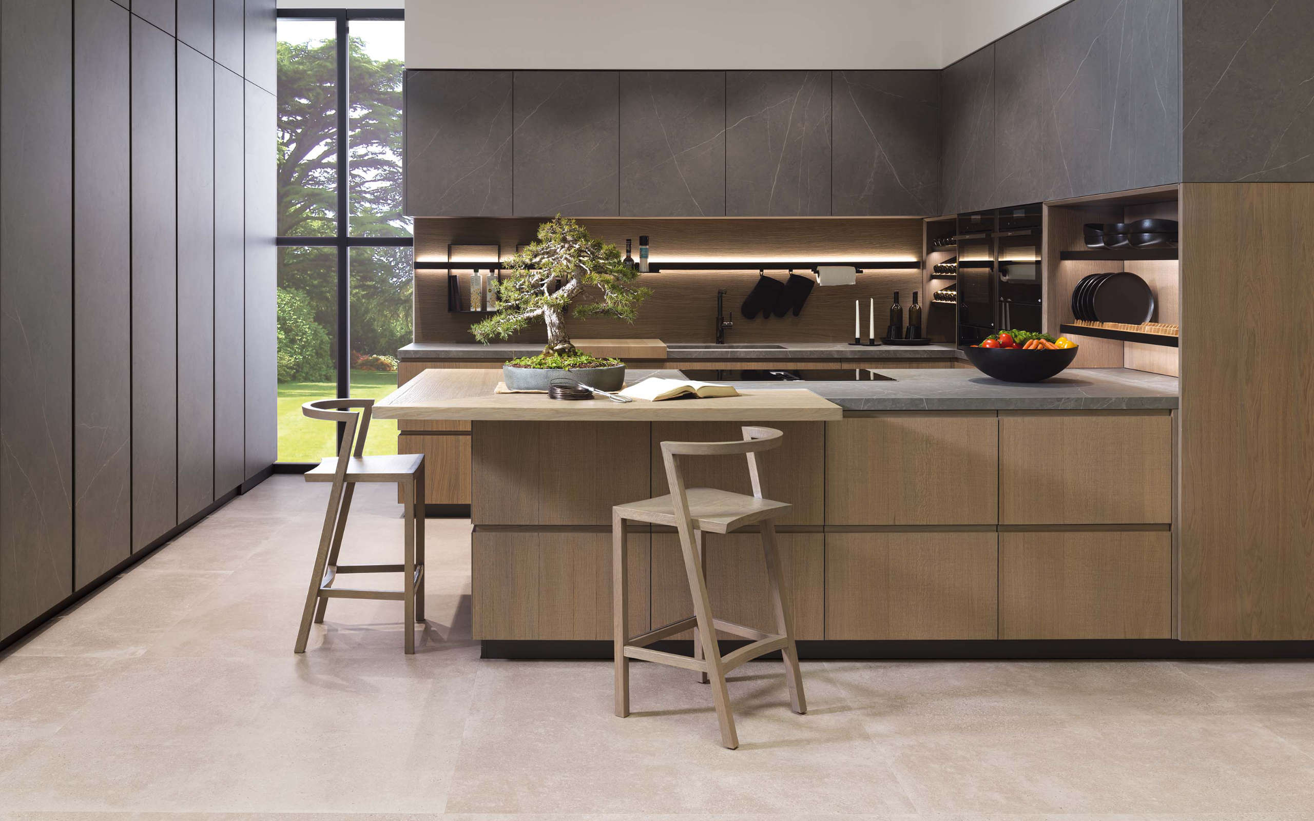 Porcelain surfaces and warm oak cabinetry in a light-filled kitchen with integrated lighting and casual seating.